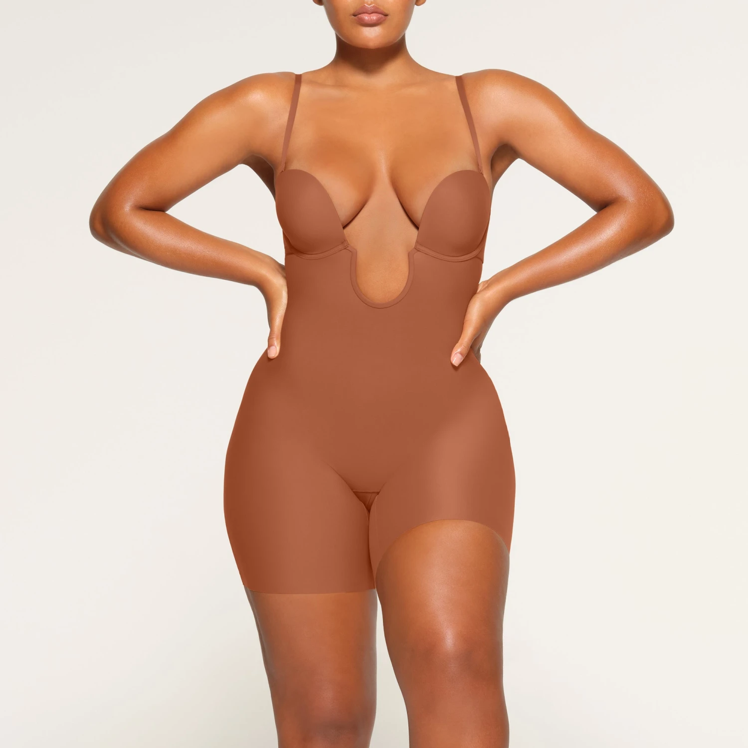 DEEP PLUNGE SHAPEWEAR MID THIGH BODYSUIT | BRONZE