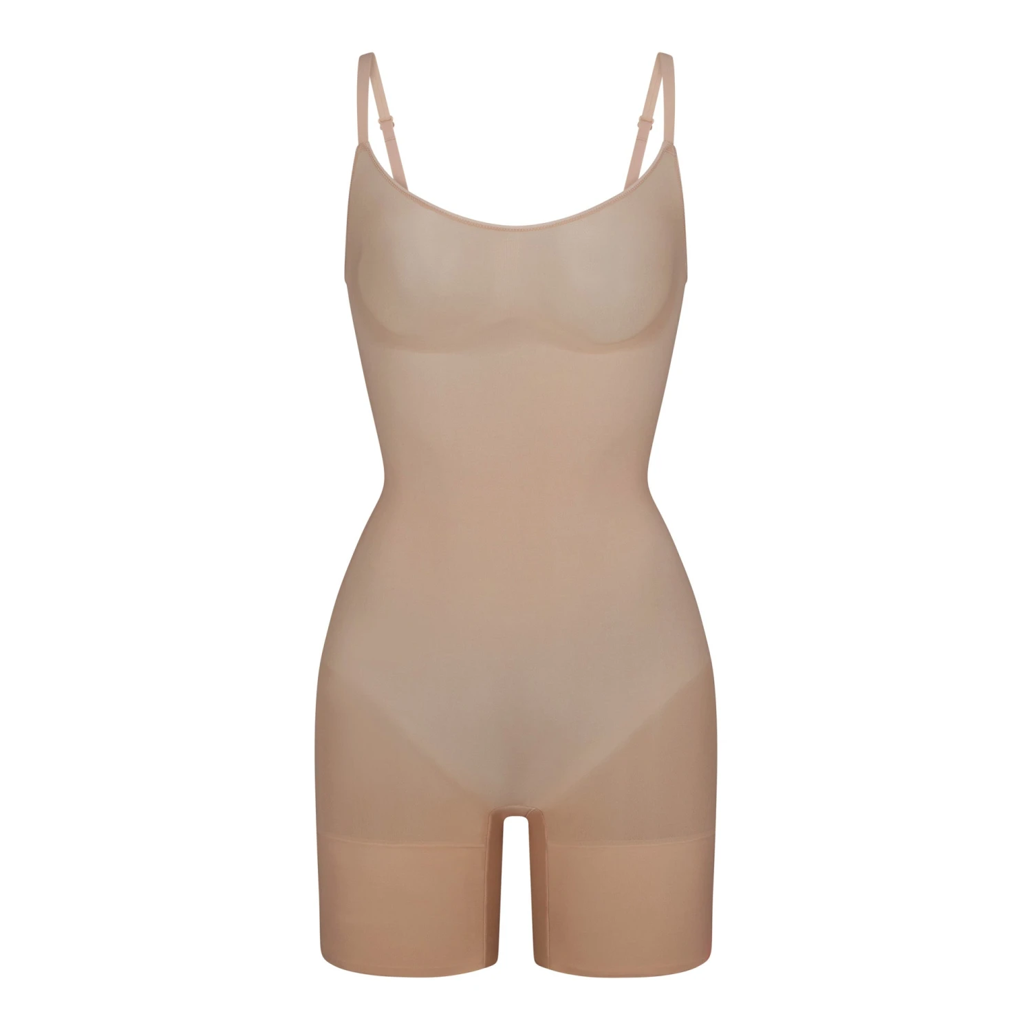 This front scoop neck, low back mid thigh bodysuit was made for everyday sculpting with its soft, stretchy fit and targeted mid-level compression along the tummy and waist that perfectly defines your silhouette. Features butt pockets to lift and define the butt, front pique details for bust definition, adjustable convertible straps with hooks that can be worn at the shoulder or as cross back, no-dig double-ply compression at the thighs, and an open gusset. Fits true to size.