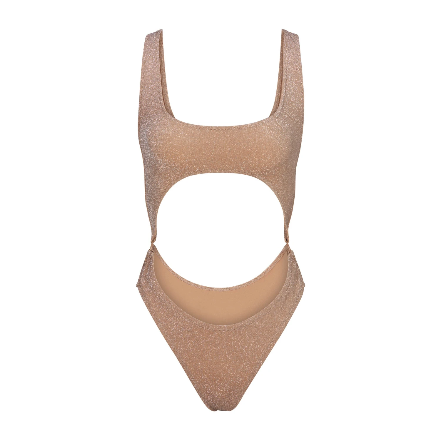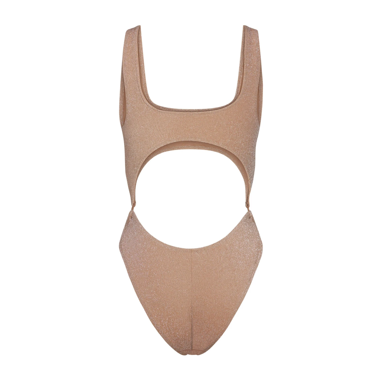 has front and back cut-out details and tonal metal rings at the sides for an ultra-luxe look. Features a front scoop neckline, non-adjustable straps, medium back coverage, and recycled polyester lining. Fits true to size.