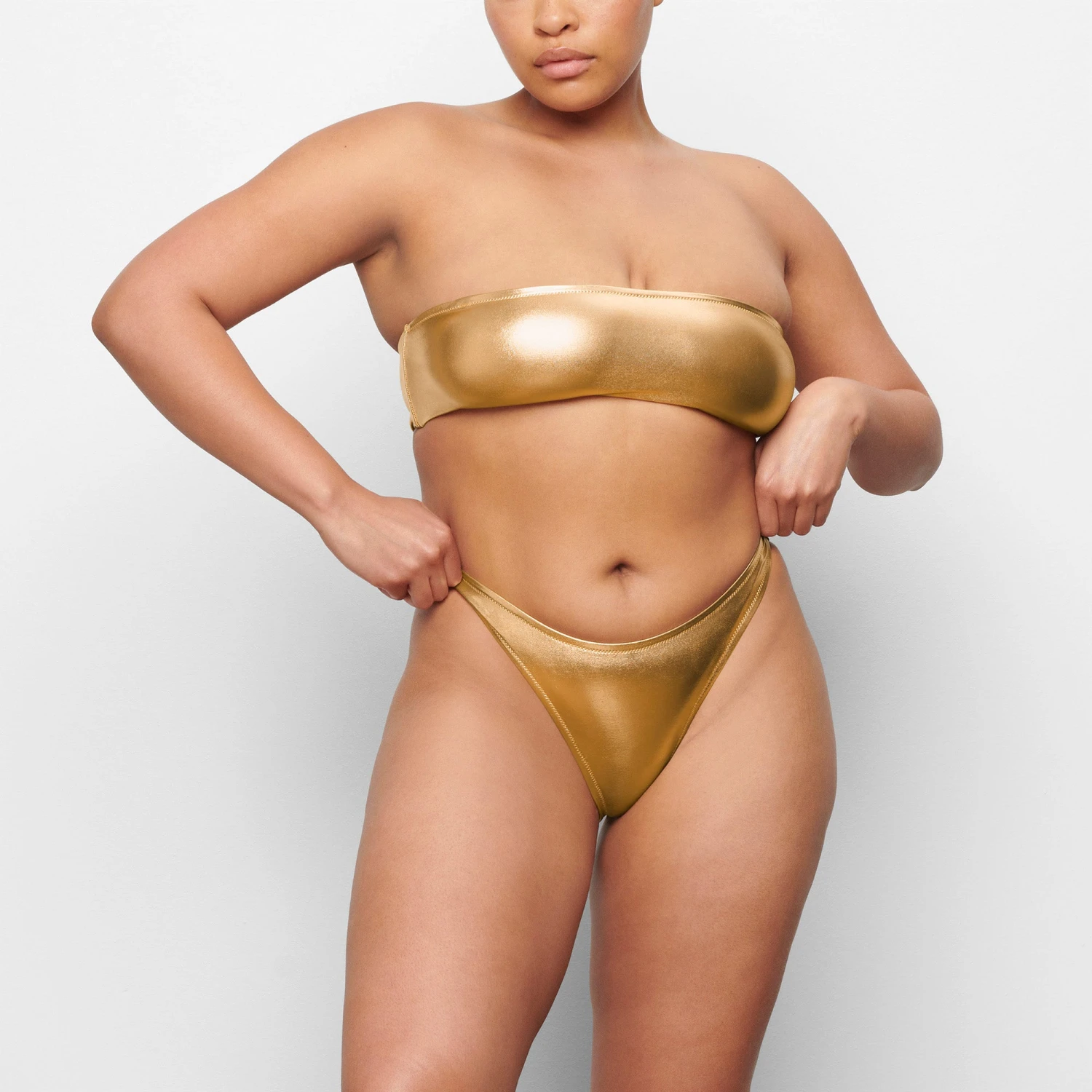 . With a dipped front and fuller back coverage, this style pairs perfectly with the Mock Neck Swim Tank, Triangle Top, or Bandeau. Fits true to size.
