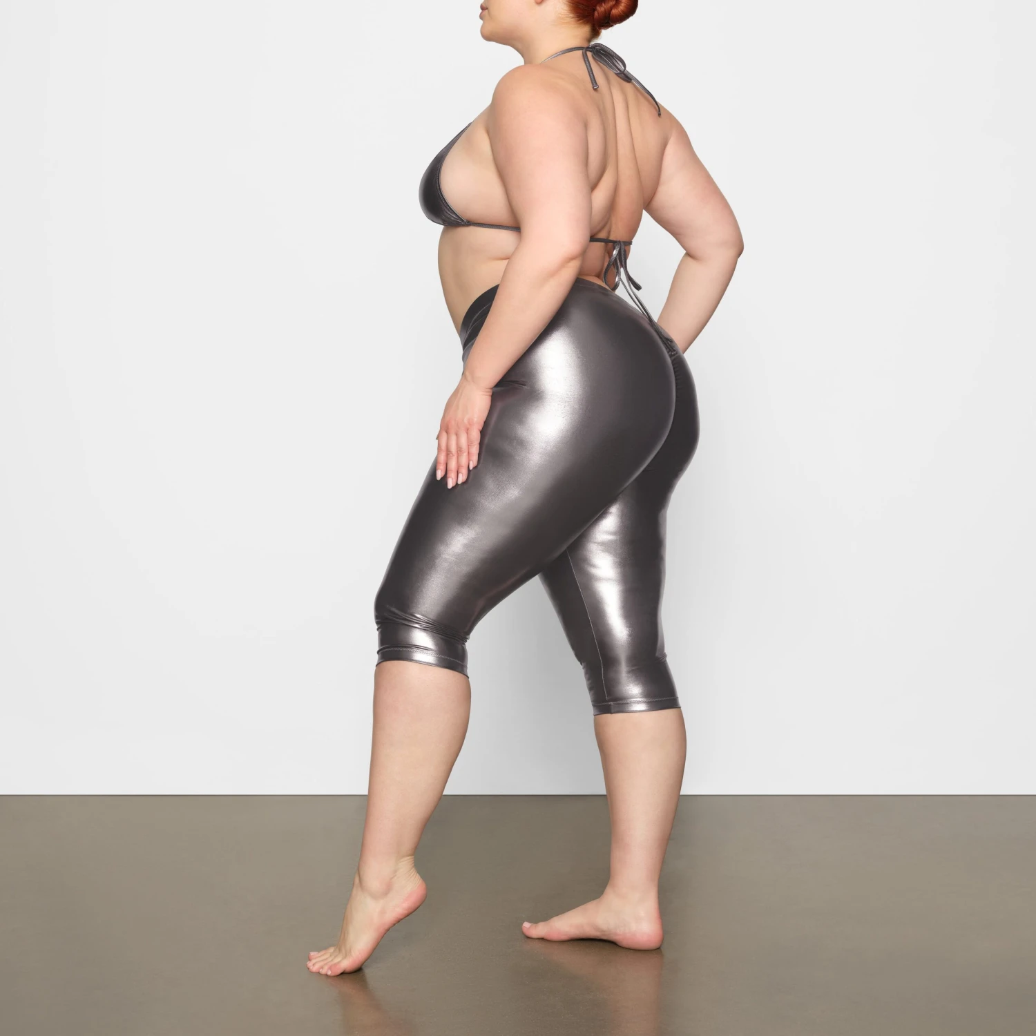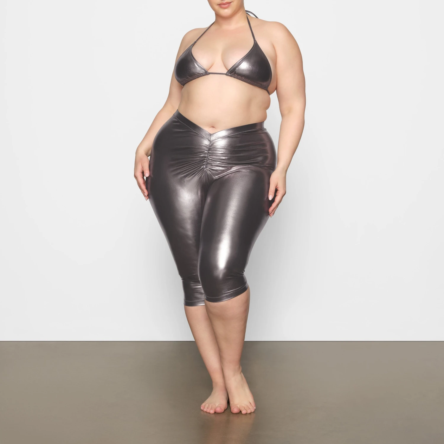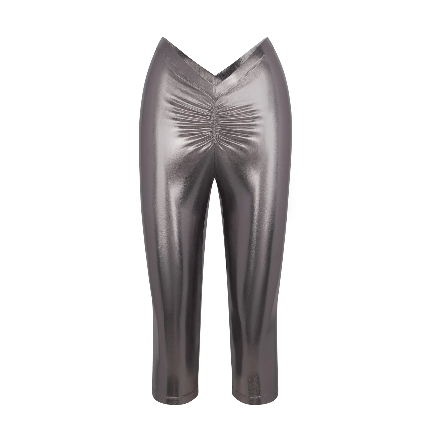 have a dipped front and back and a sexy metallic finish for a stand-out look. Features a light lining and flattering ruching along the center front and back seams. Fits true to size.