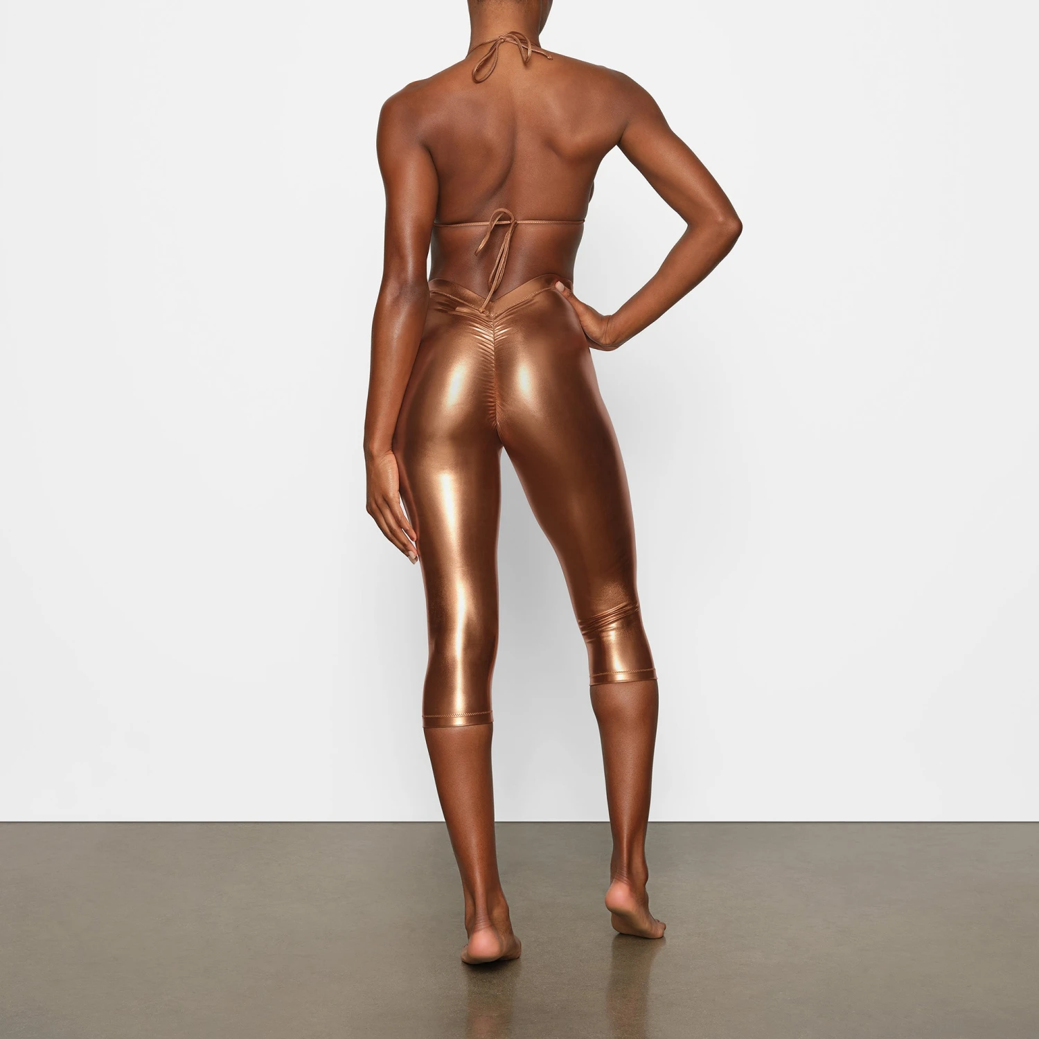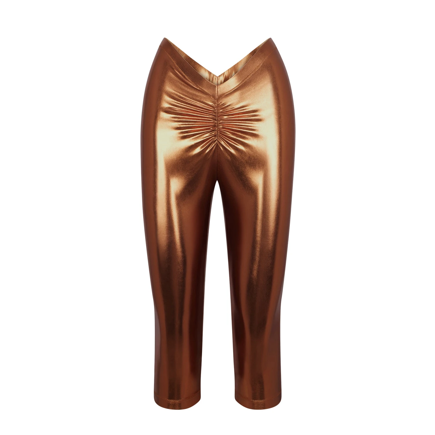 have a dipped front and back and a sexy metallic finish for a stand-out look. Features a light lining and flattering ruching along the center front and back seams. Fits true to size.