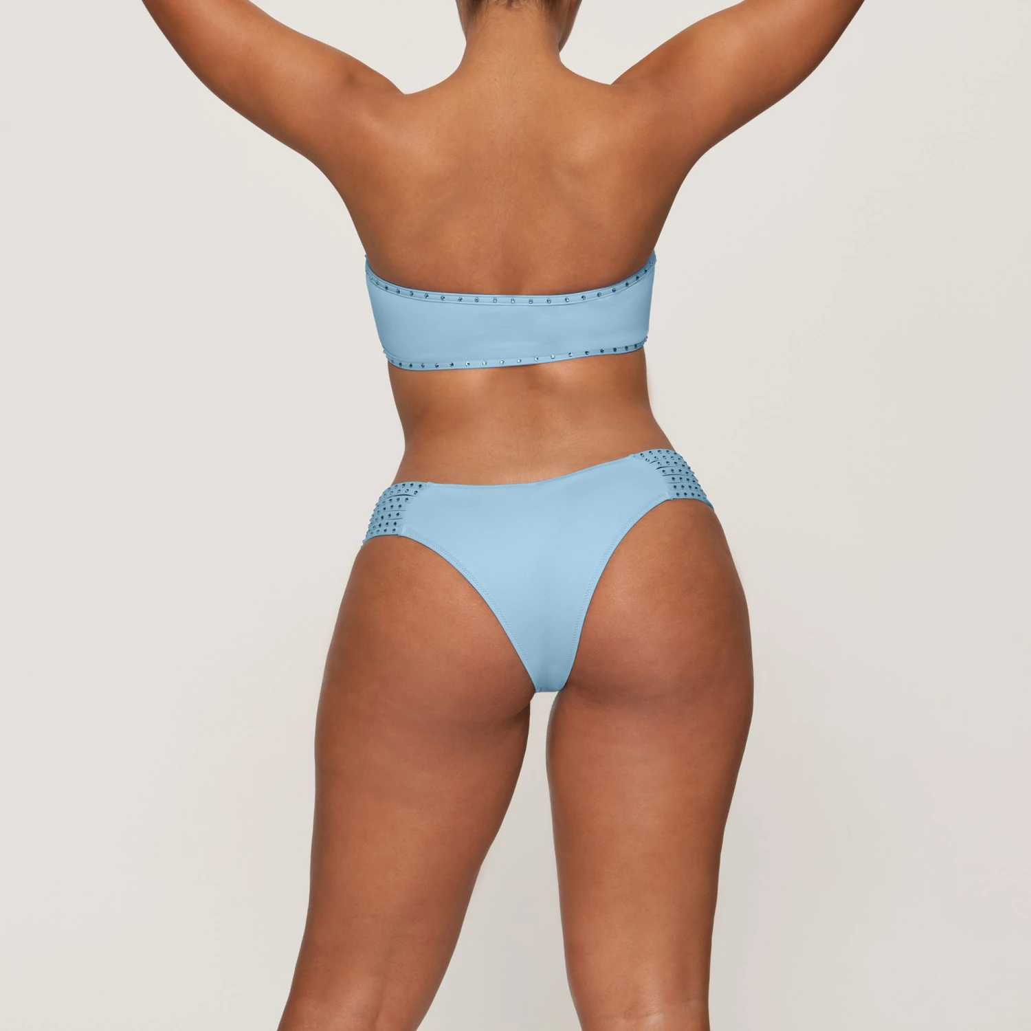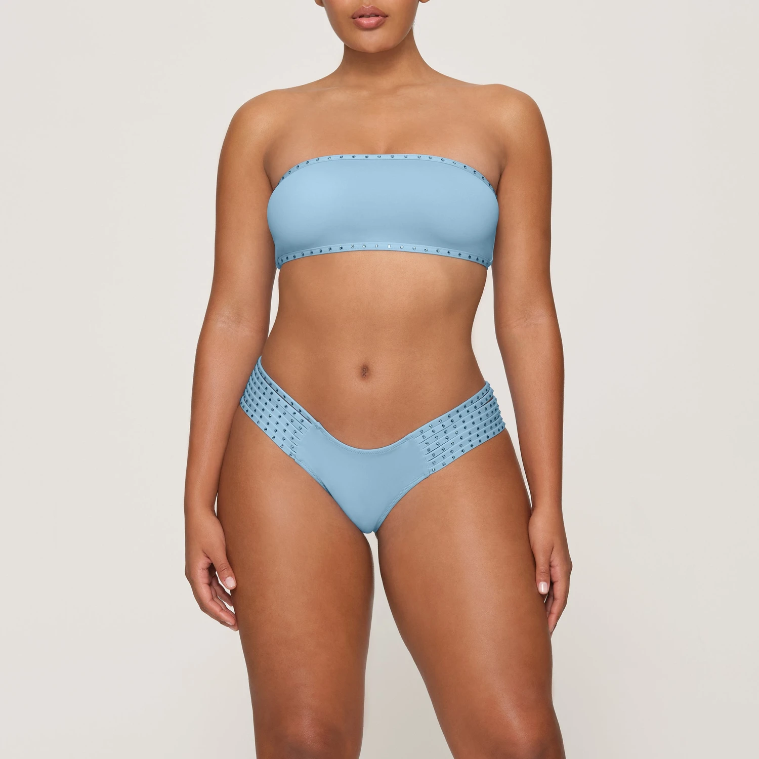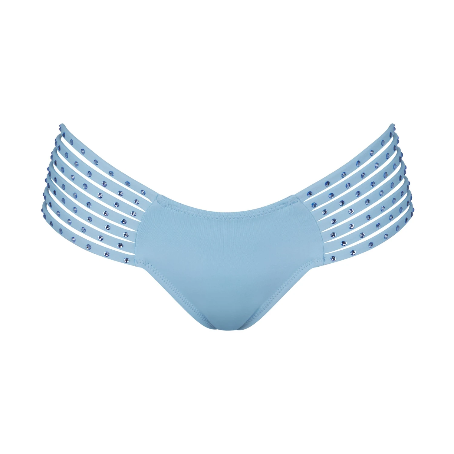 has strappy sides adorned with tonal rhinestones for a show-stopping look. Features cheeky back coverage. Make it a set with the coordinating