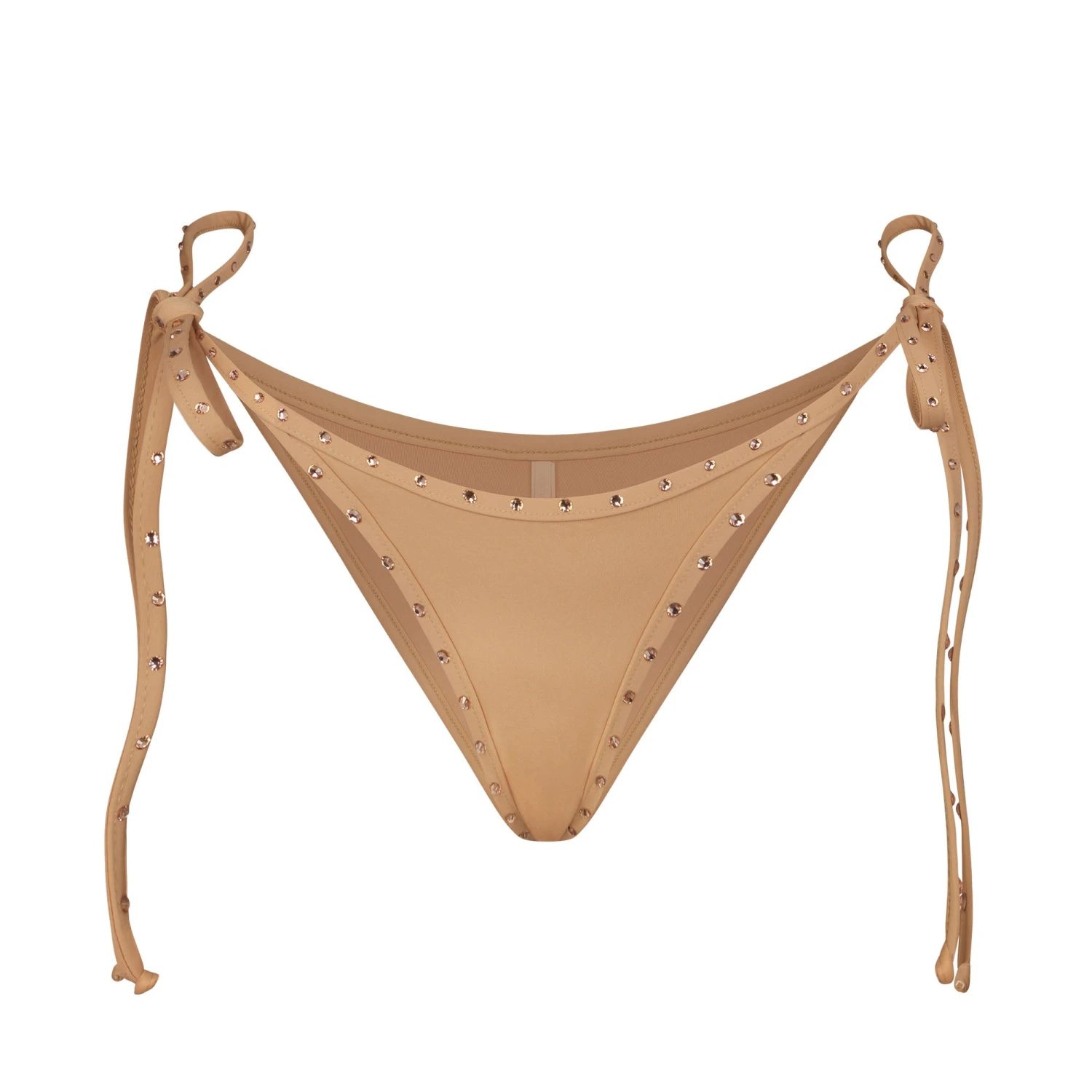 . Features long tie sides embellished with tonal rhinestones and cheeky back coverage. Make it a set with the coordinating