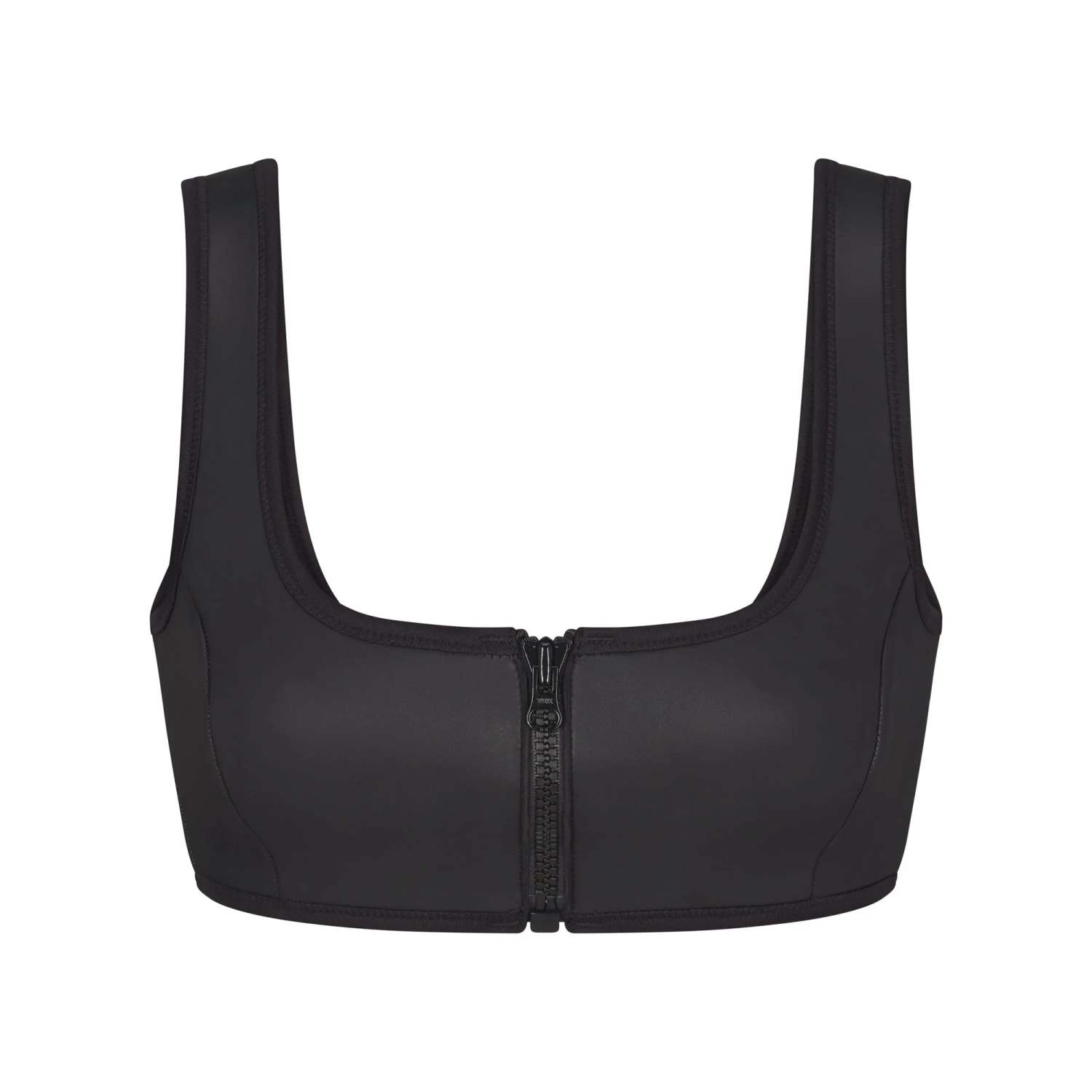 has a slick, wet look and sexy zip front closure. Features non-adjustable thick straps and seaming details. Complete the look with the coordinating Scuba