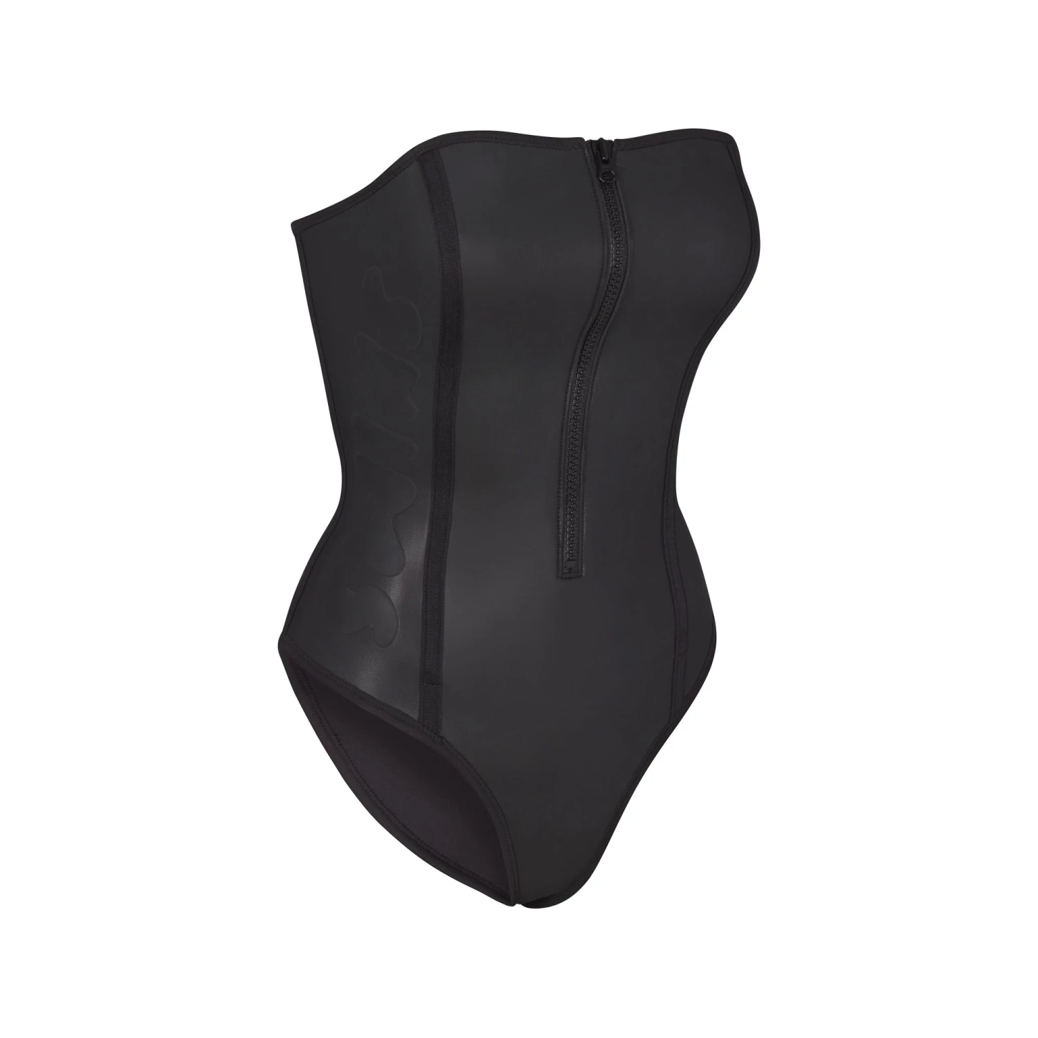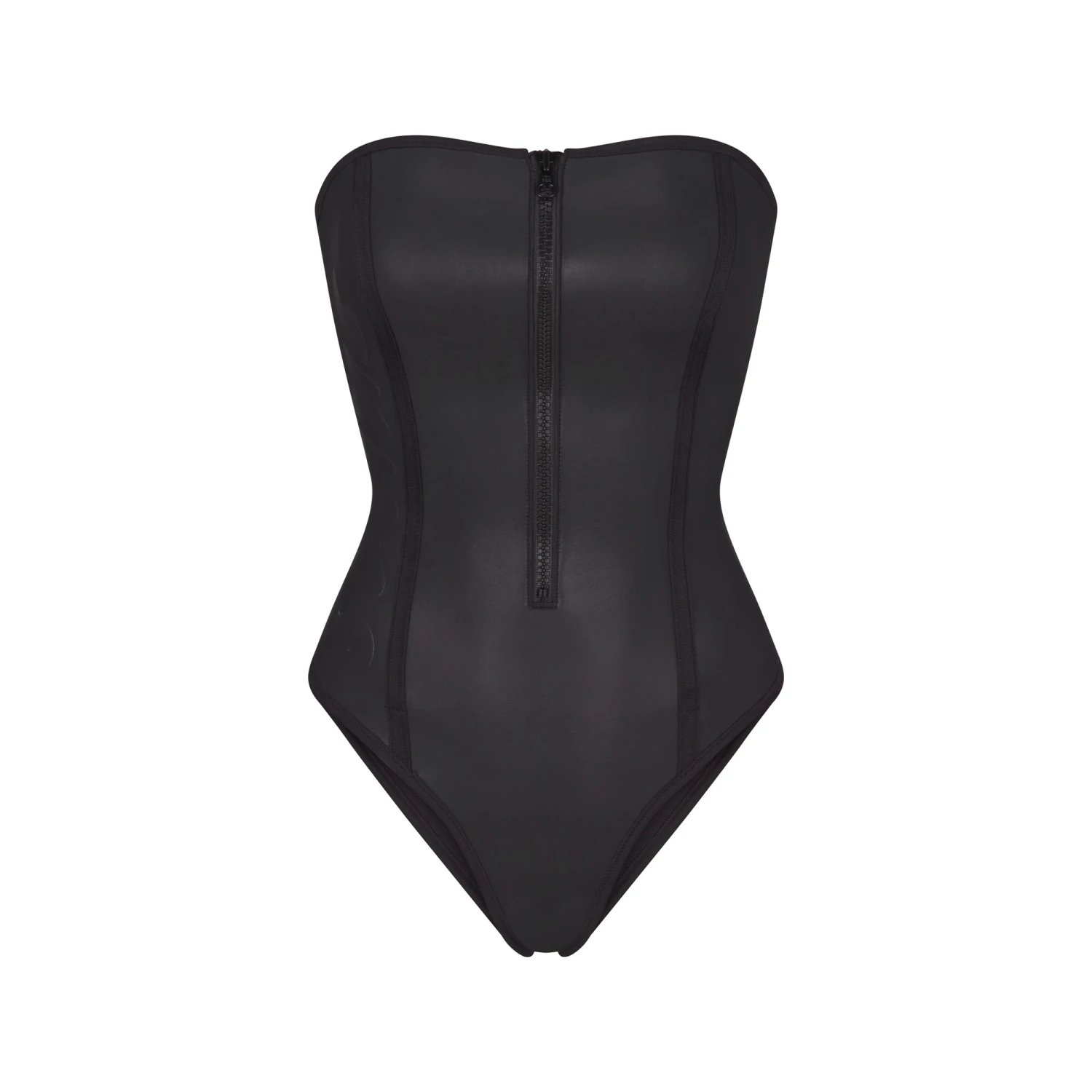 that has a sexy center front zipper for the coverage of your choice. Features cheeky back coverage and SKIMS logo details.