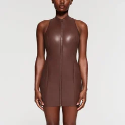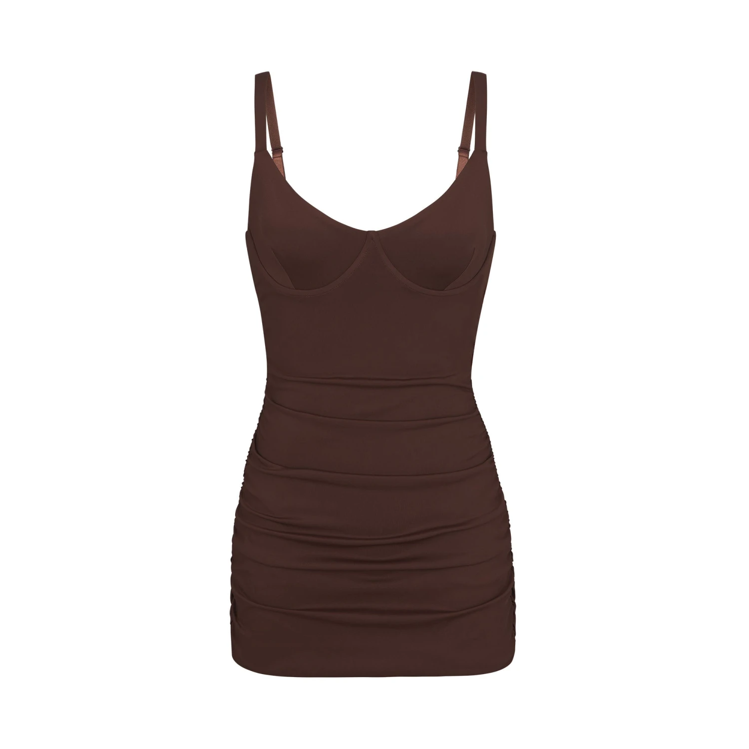 . Features flattering ruching details, a deep scoop plunge back, and thick non-adjustable straps. Fits true to size.