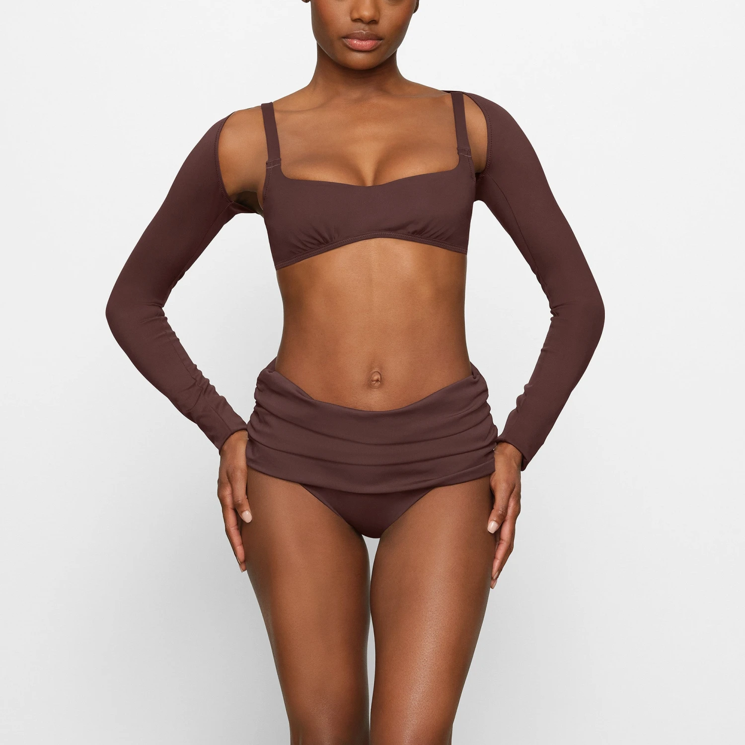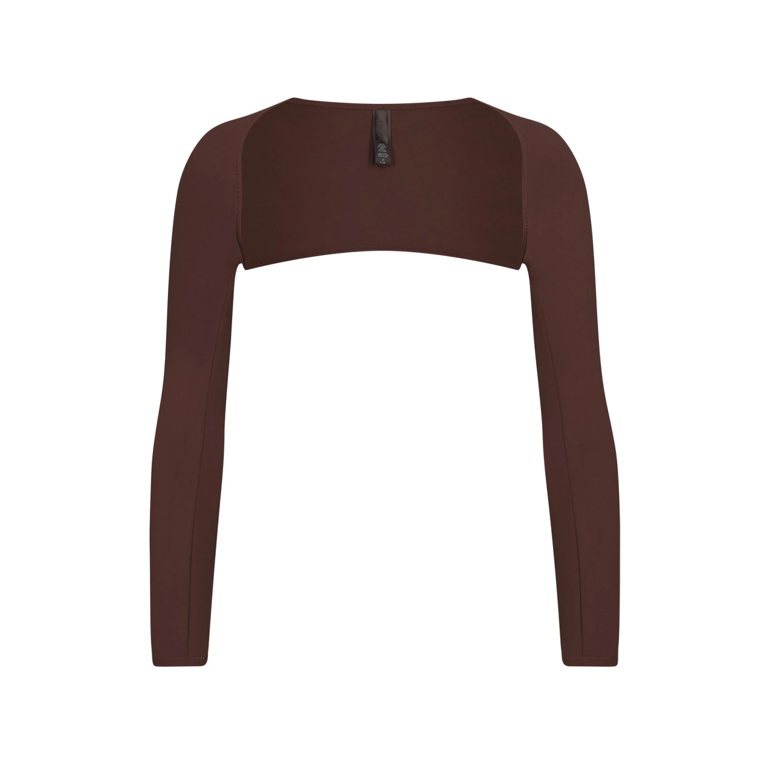 shrug that smooths your arms and adds extra coverage and sun protection. Features an open front with long sleeves. Layer over Shaping Swim