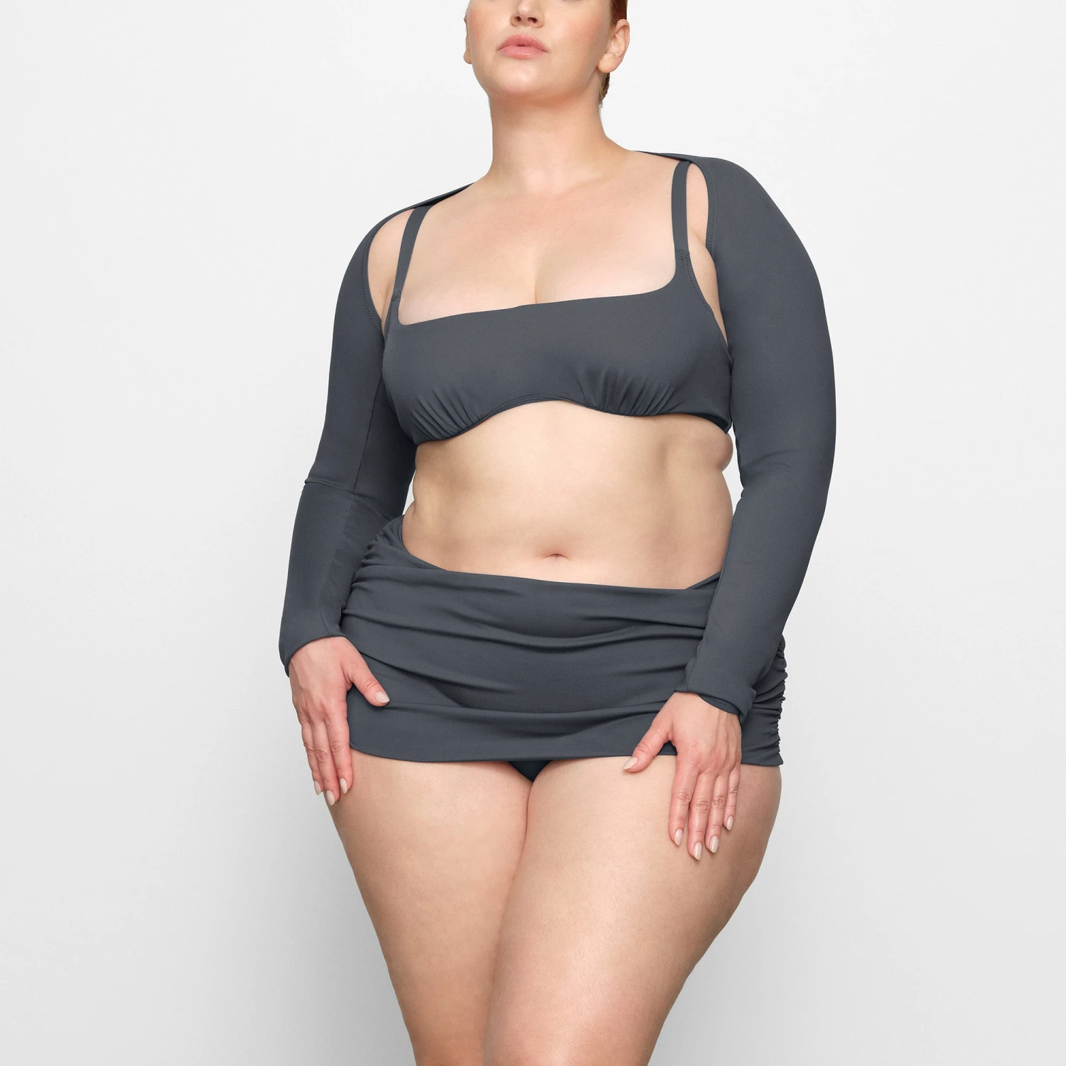 shrug that smooths your arms and adds extra coverage and sun protection. Features an open front with long sleeves. Layer over Shaping Swim