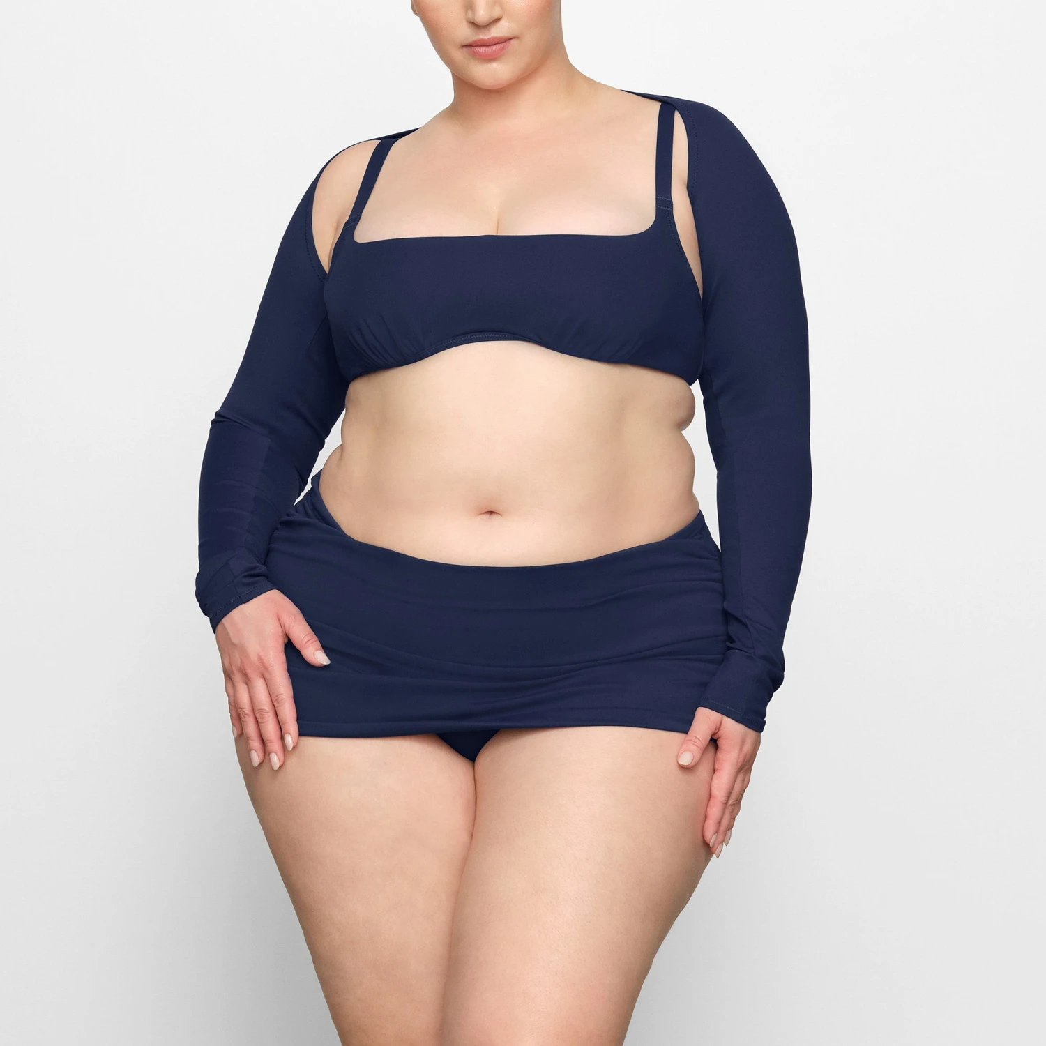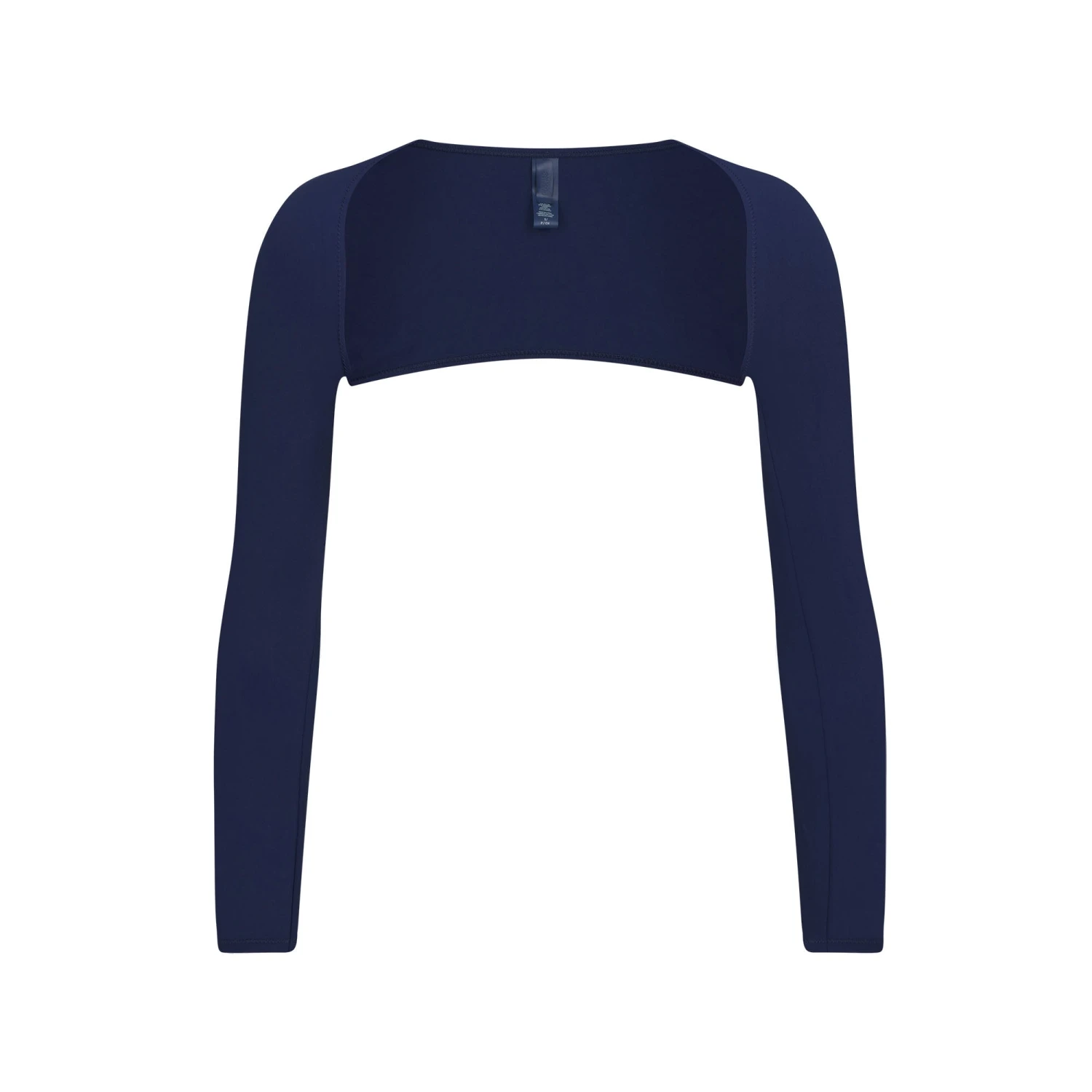shrug that smooths your arms and adds extra coverage and sun protection. Features an open front with long sleeves. Layer over Shaping Swim