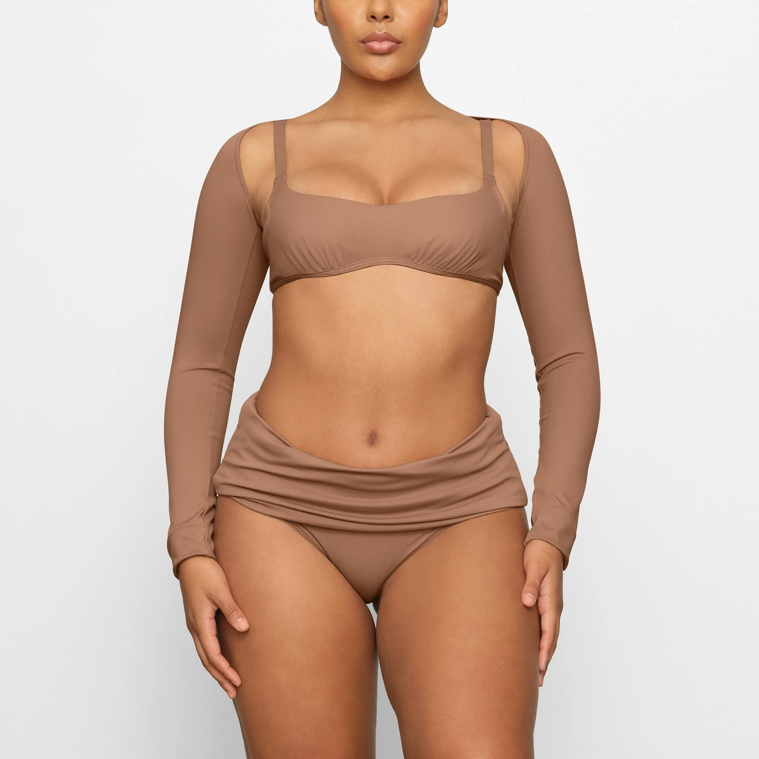 shrug that smooths your arms and adds extra coverage and sun protection. Features an open front with long sleeves. Layer over Shaping Swim