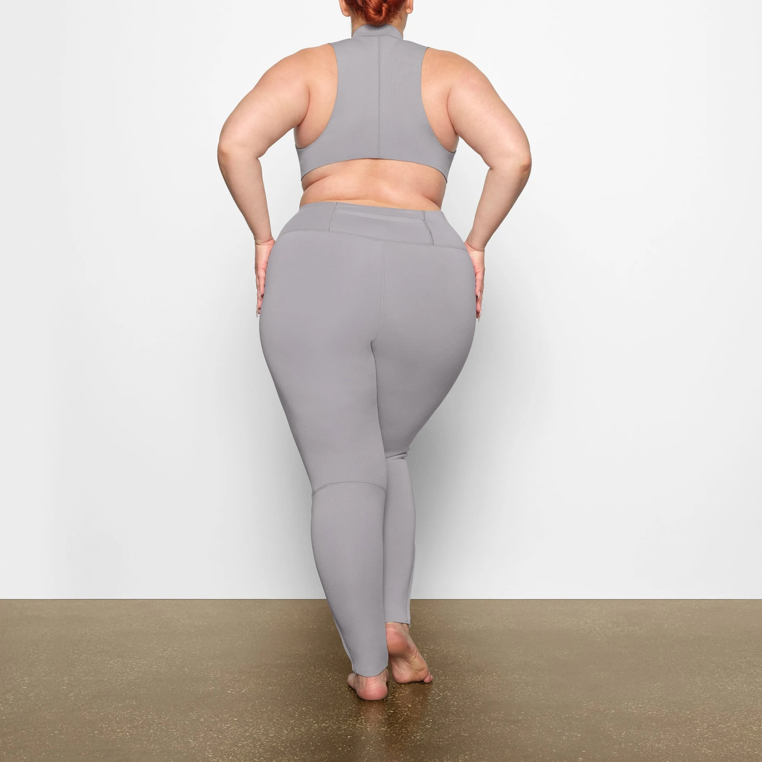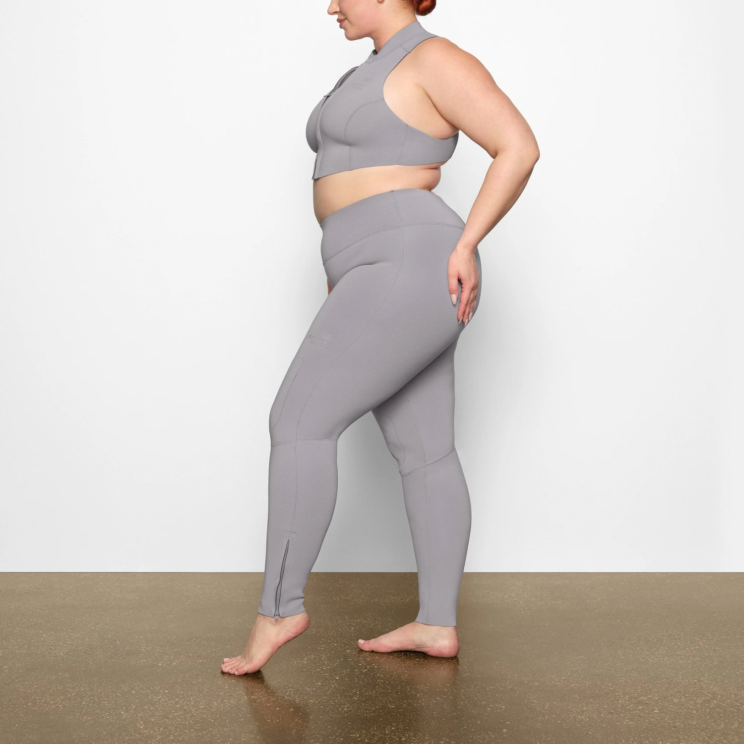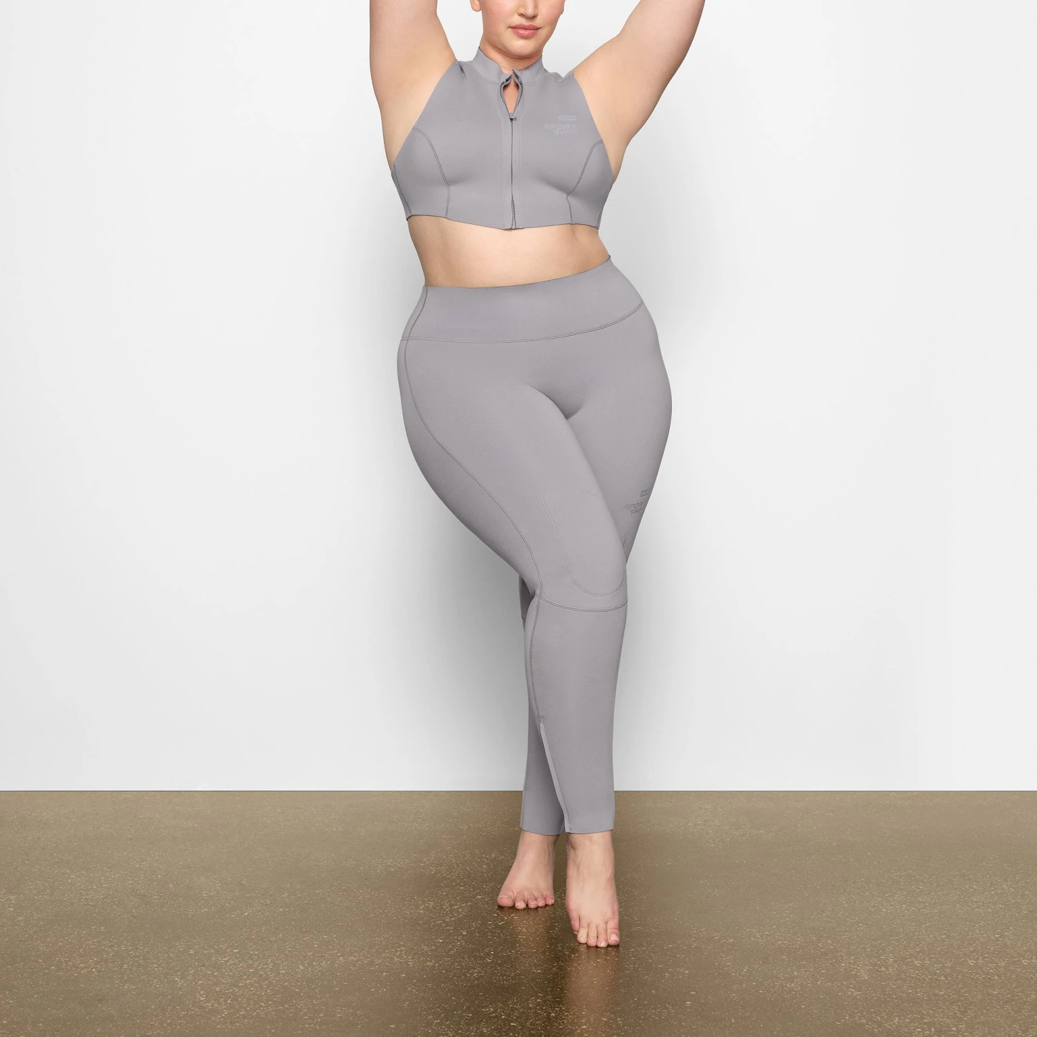 with a mid-rise, full-length fit and zip details at the ankle and center back. Features a glossy tonal SKIMS logo, plus an extra layer of neoprene at the knees. Fits true to size.