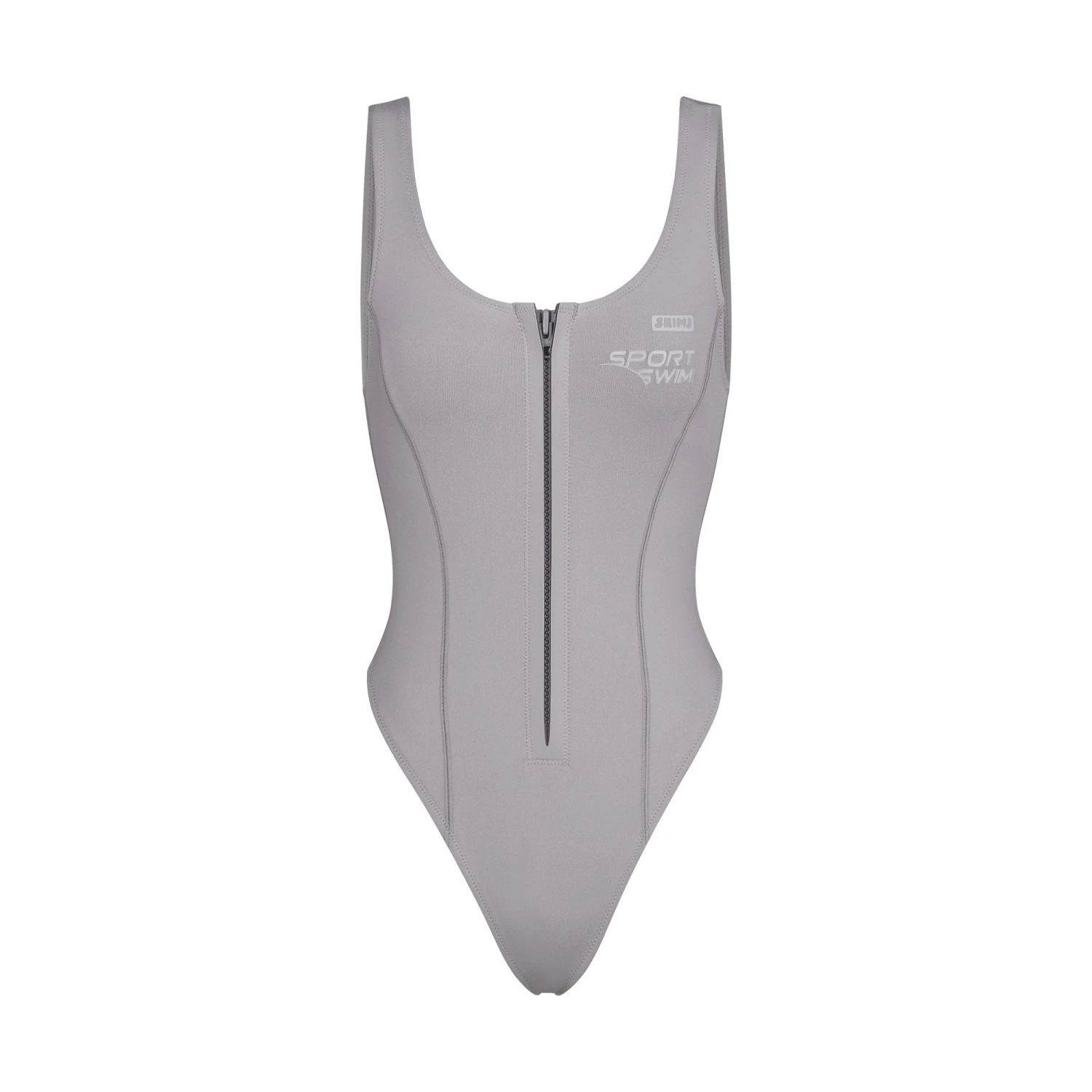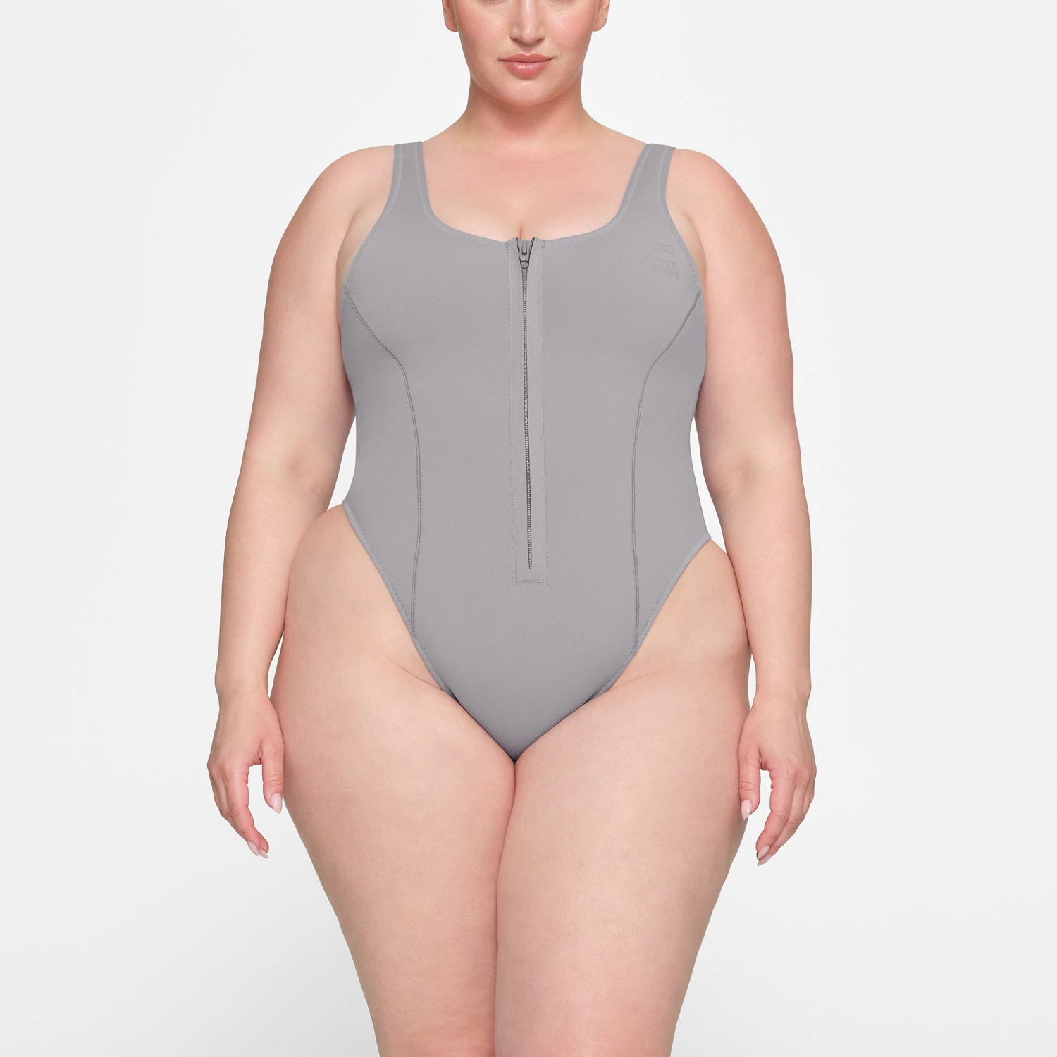 with a flattering high-cut leg all summer long. Features a center front zipper for your desired look, a plunging scoop back, medium back coverage, and a glossy tonal SKIMS logo. Fits true to size.