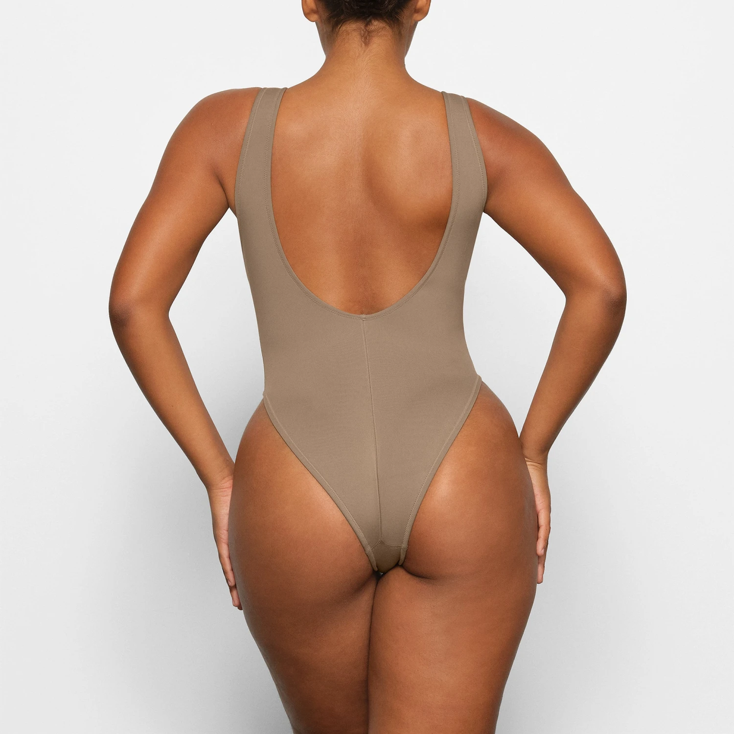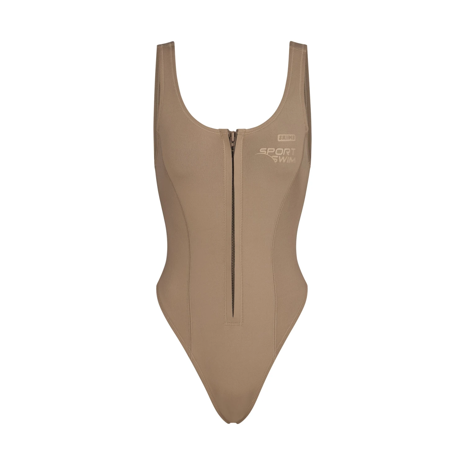 with a flattering high-cut leg all summer long. Features a center front zipper for your desired look, a plunging scoop back, medium back coverage, and a glossy tonal SKIMS logo. Fits true to size.