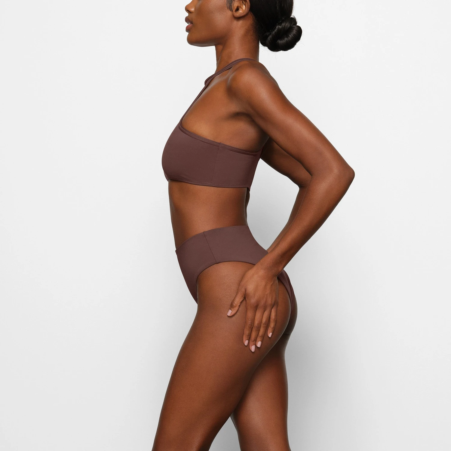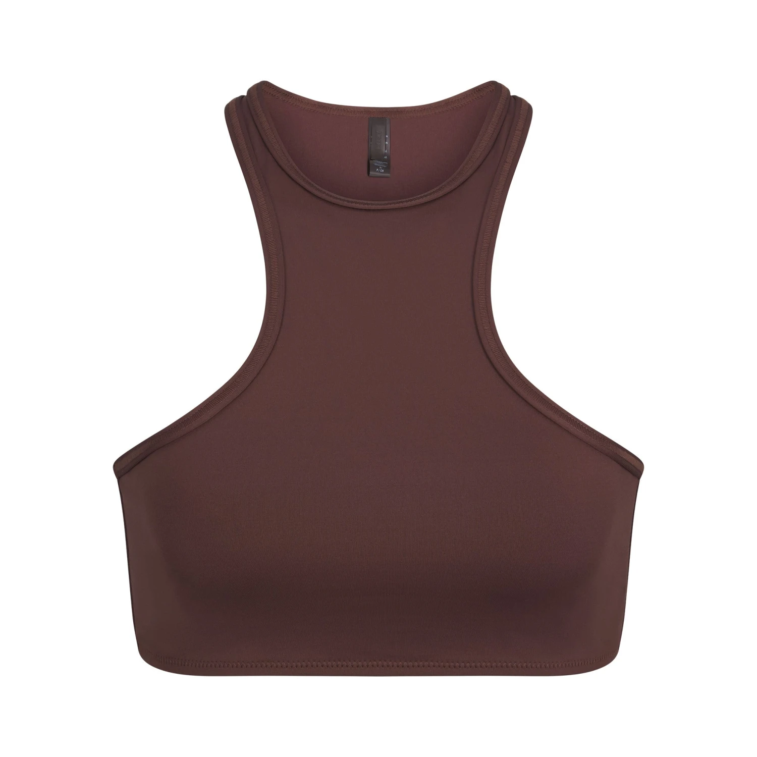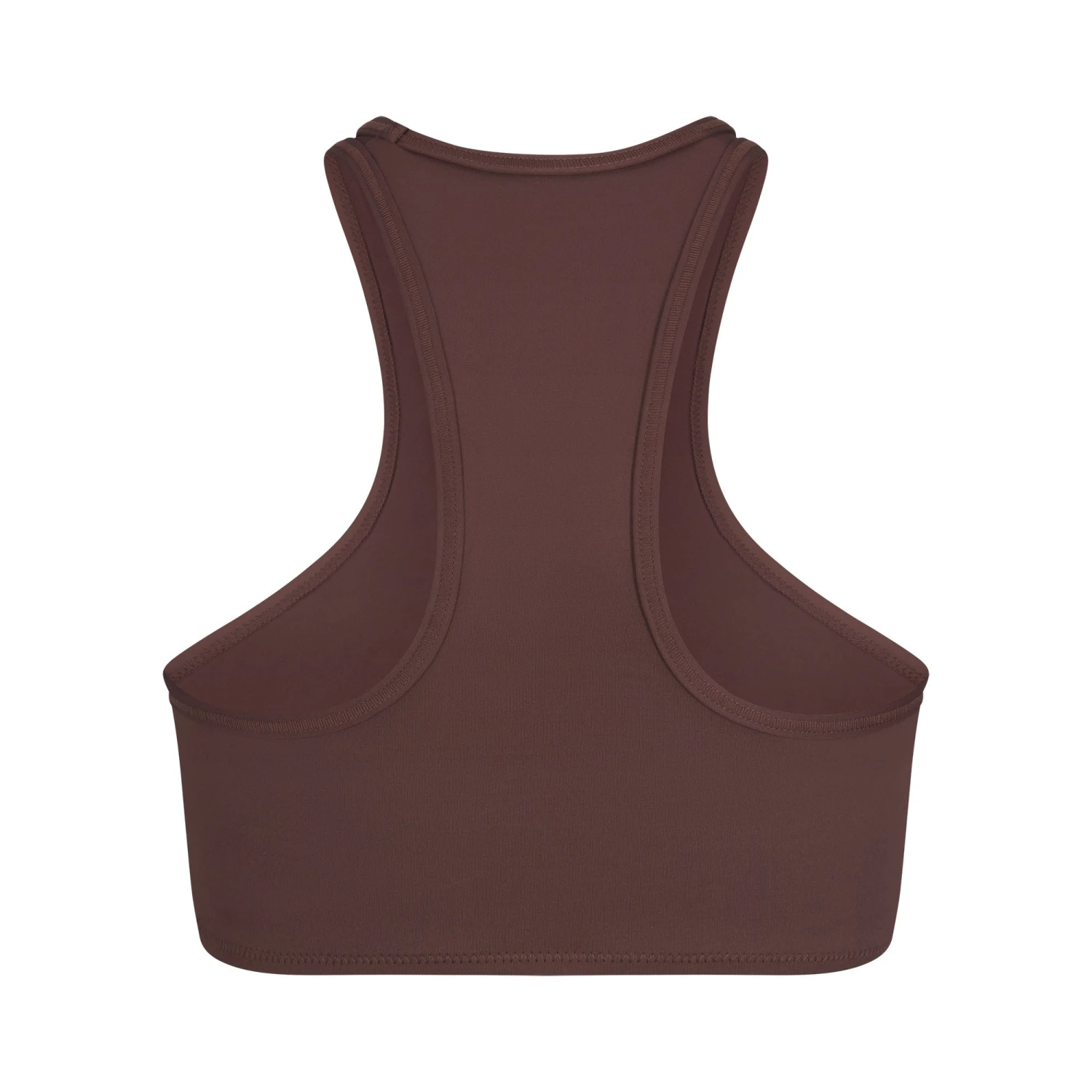 A sporty, high crew neck silhouette with the cutest front and back racer details. This