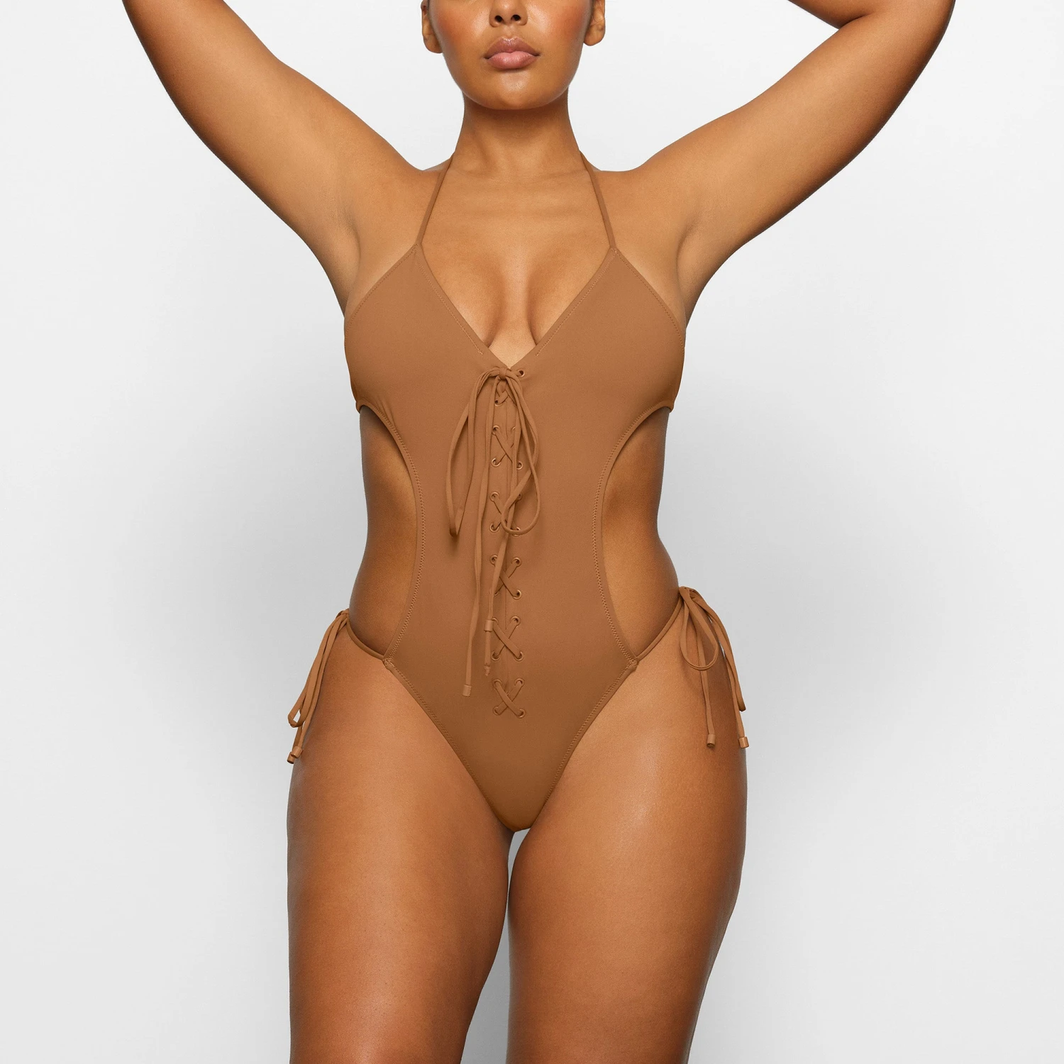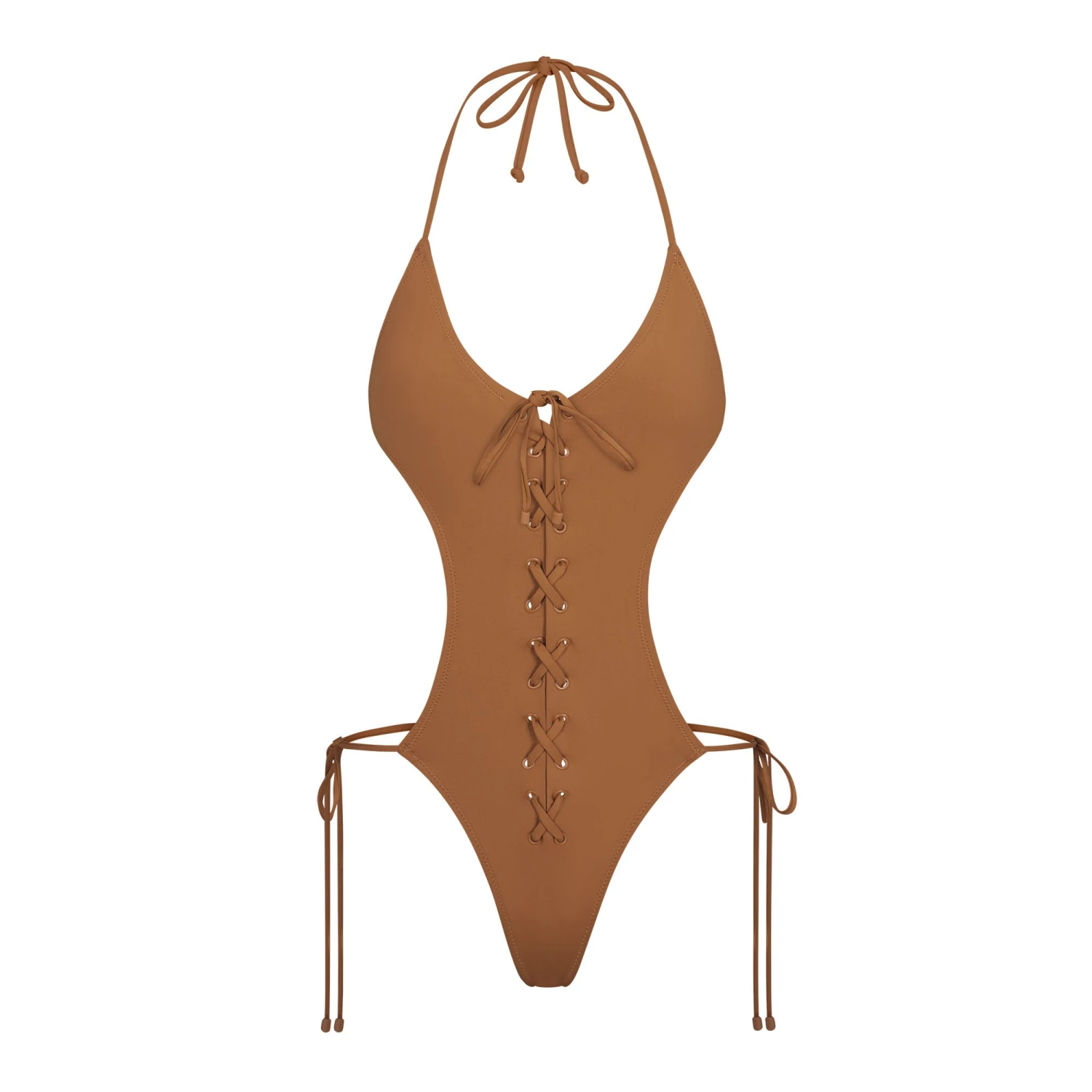 was made to flatter and stand out. Features front lace-up details with eyelets and adjustable ties at the neck and center back for support. Size up for the best fit.