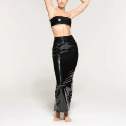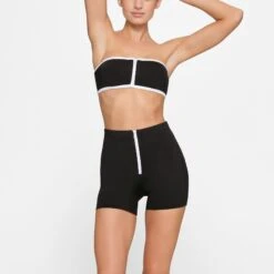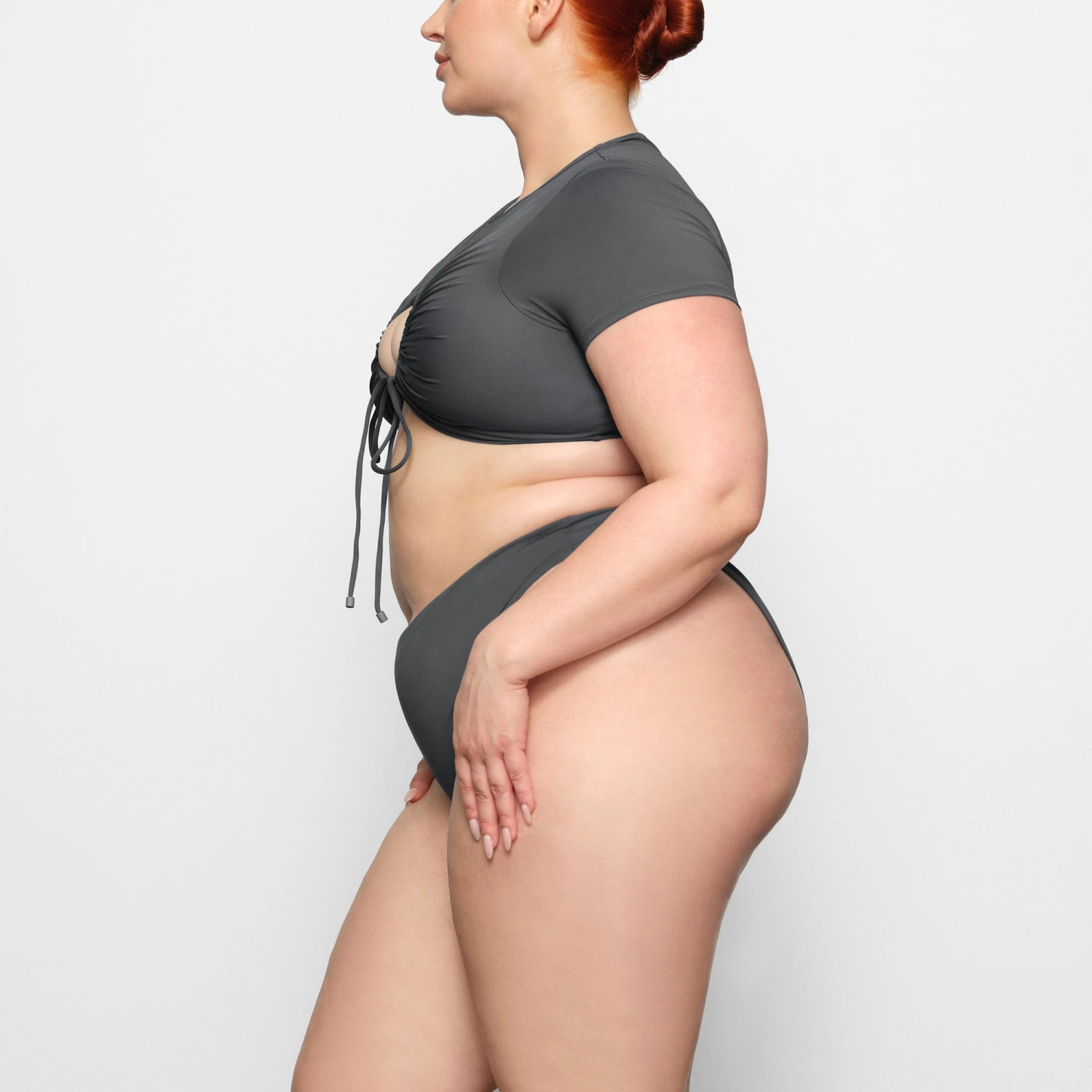 features a center front keyhole with ruching, a high crew neckline, and adjustable ties. Fits true to size.