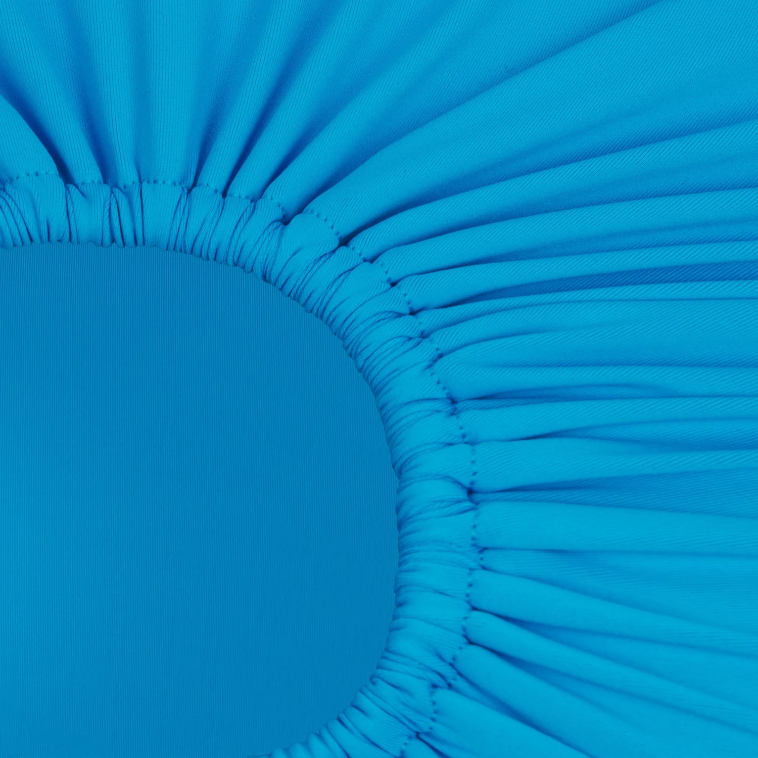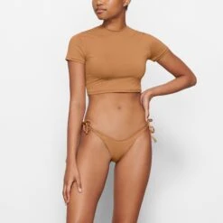 features a center front keyhole with ruching, a high crew neckline, and adjustable ties. Fits true to size.