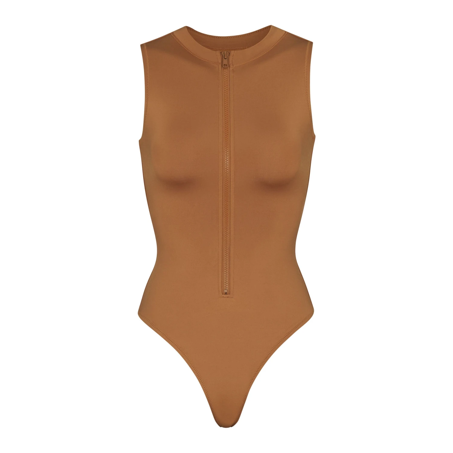 SWIM ZIP FRONT SLEEVELESS ONE PIECE | ALMOND