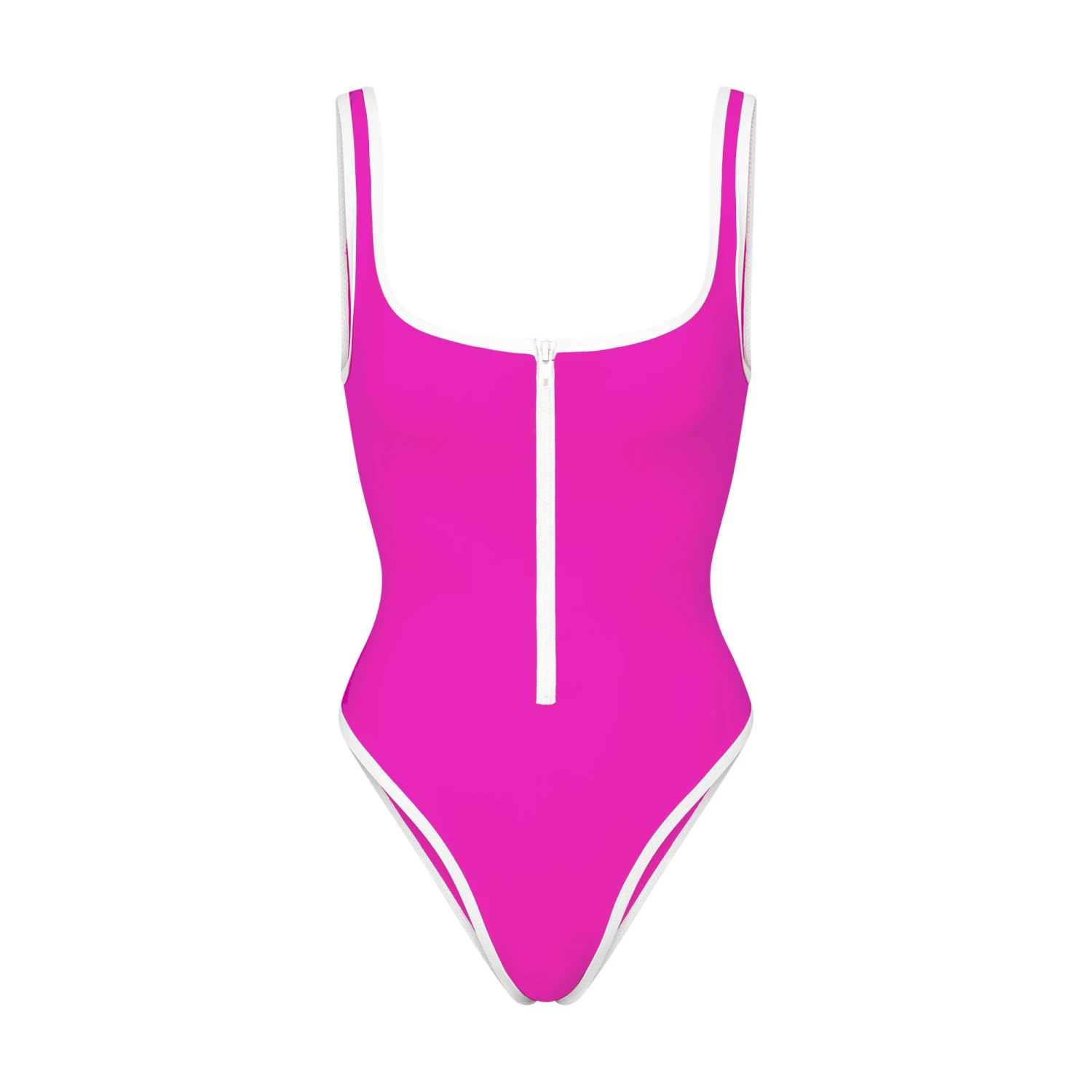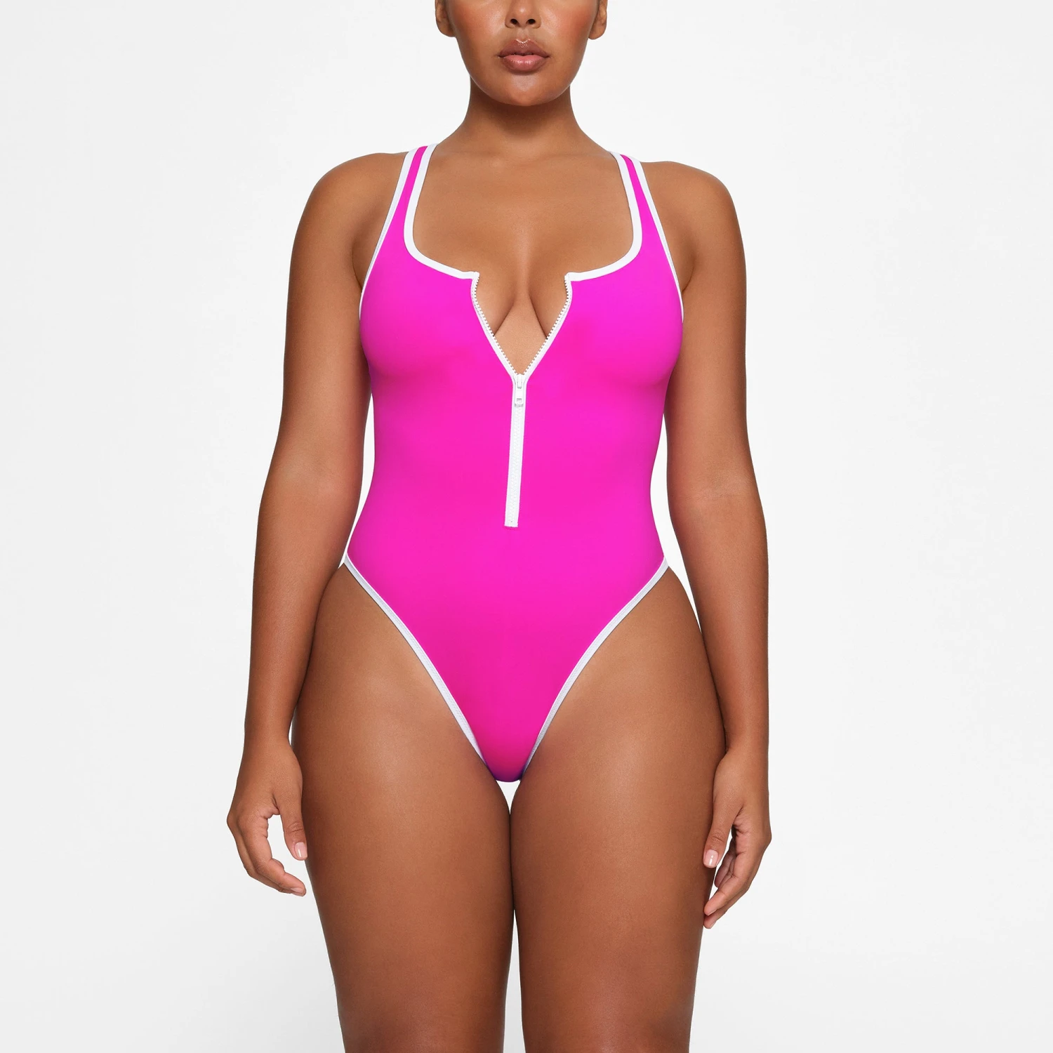 has a vintage-inspired look thatโs timeless and flattering. Features a brief back with medium coverage and a center front zipper. Fits true to size.