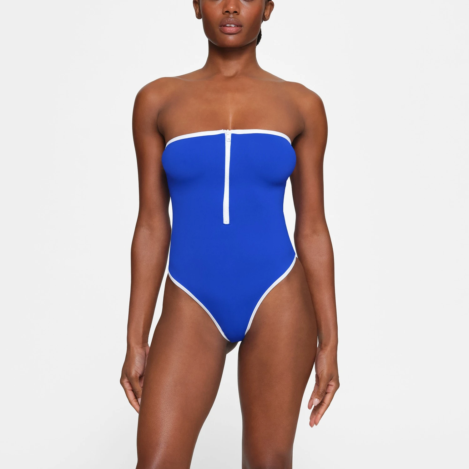 silhouette. Features a brief back with medium coverage and a center front zipper. Fits true to size.